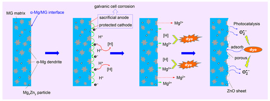 It is well known that pure Mg and most of the Mg alloys can be used as anode materials to protect metal components from corrosion [57,58], according to the sacrificial anode theory. In our opinion, the α-Mg solid solution phase can play a key role in improving the azo dye degradation performance of the in situ MgZn-based MGMCs. Figure 9 shows the corresponding azo dye degradation mechanism based on the galvanic cell corrosion theory. The in situ MgZn-based MGMCs are composed of α-Mg, Zn-rich Mg-Zn intermetallic particles and MG matrix phase with high Mg content, in which the MG phase and α-Mg dendrite both have high volume fractions. When the composite sample is put into the DB6 solution, a small primary cell can be formed on the α-Mg/MG interface, and α-Mg dendrite acts as sacrificing anode with the reaction Mg − 2e− → Mg2+. It forms a negative charge layer on the surface of the MG matrix, effectively preventing the discharge corrosion of MG as a cathode by sacrificing the α-Mg dendrite anode. In addition, the electrons e− generated by the α-Mg dendrite combine with H+ to generate [H] [21], which diffuses into the solution and reacts with the dye molecules. As a result, azo dyes with a macromolecular structure are reduced and decomposed into small molecules.