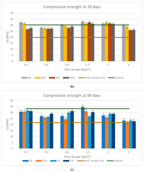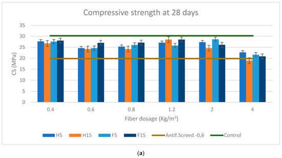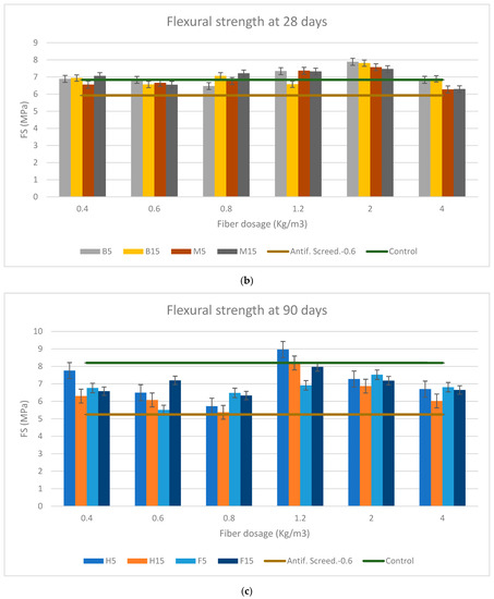 The references of the control specimen and with synthetic fibers with a dosage of 0.6 kg/m3 are included. This reference dosage has been chosen because it is the commercialized dosage by Vicat with which all the results are compared. It should be noted that the flow of the reinforced mortars dropped as the fiber content rose beginning at 0.8 kg/m3. This decrease can be neglected at the scale of the rheological characteristic of the mortar except for the dosage of 4 kg/m3 in the case of the soft fibers, where the loss of workability became appreciable. Due to the interlocking of the fibers, it is obvious that increasing the fiber dosage and aspect ratio (AR) has a negative effect on workability. This result is in accordance with several studies [52,53,54,55,56,57,58].