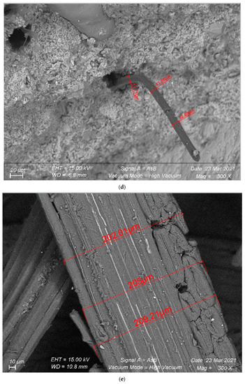 One of the important parameters discussed throughout this article is the aspect ratio (AR: length/diameter); it is thus presented in Table 6. The AR was calculated by taking into account the actual length of the fibers (Table 1) and the average diameter calculated from the SEM images taken for each fiber in its raw state and with the fiber embedded in the mortar.