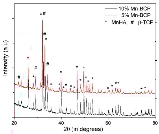 The XRD pattern of 5% Mn-BCP and 10% Mn-BCP are shown in Figure 1. In the synthesized Mn-BCP scaffolds, Mn-HA and β-TCP peaks were present and are quite similar to the stoichiometric HA diffraction peaks (JCPDS no. 9-0432) and (JCPDS no. 9-0169), respectively. The doped Mn-BCP nanoparticles did not show any additional impurities, according to the XRD pattern.