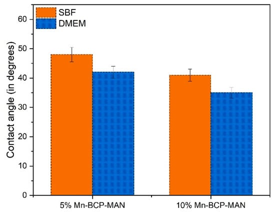 In both media, the 10% Mn-BCP-MAN scaffold had lower contact angles than the 5% Mn-BCP-MAN scaffold (Figure 2). Further investigation revealed that DMEM contact angles of the 5% Mn-BCP-MAN scaffolds were as low as 42° ± 2.04, whereas SBF contact angles were 48° ± 2.44. Meanwhile, DMEM and SBF had contact angles of 35° ± 1.81 and 41° ± 2.06 for 10% Mn-BCP-MAN, respectively.