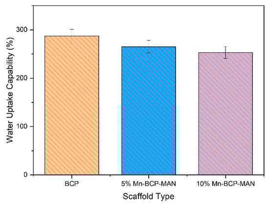 The water uptake capability of the soaked scaffolds after different soaking periods of 0, 1, 4, and 7 days is depicted in Figure 3. A significant change in swelling ratios of the scaffolds was observed. The swelling was higher in 5% Mn-BCP-MAN scaffolds (287 ± 14), but it decreased to 253 ± 13% for 10% Mn-BCP-MAN scaffolds.