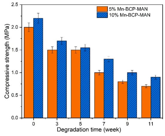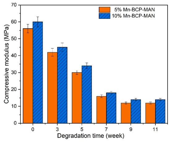 Compressive strength (Figure 4) and modulus (Figure 5) of the scaffolds were estimated from week 0–11 after degradation. The in vitro compressive strength and modulus at yield considerably decreased in the BCP scaffolds with time. However, BCP-MAN scaffolds with different Mn concentrations did not exhibit any change in the above tests.