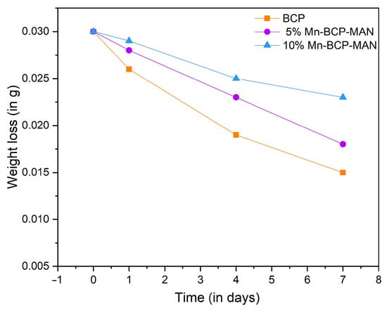 It can be seen that the rate of degradation of both the scaffolds increased as the soaking period increased (Figure 6). The 10% Mn-BCP-MAN scaffold show a lower deterioration rate in comparison to 5% Mn-BCP-MAN scaffolds. Within the time period of one week, 10% Mn-doped BCP scaffolds lose less weight than 5% Mn-doped BCP scaffolds. The biodegradation ratio reduced as the concentration of Mn increased from 5% to 10%.
