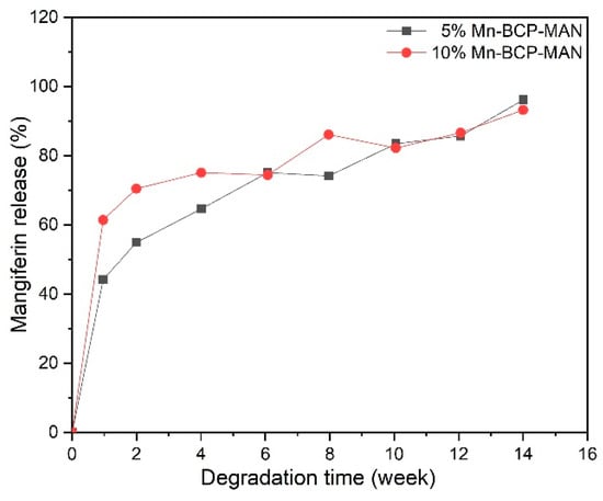 The release of MAN was closely linked with the concentration of Mn present in 5% and 10% Mn-BCP-MAN scaffolds. The total release of MAN was estimated to be about 90% for each sample (Figure 7). MAN exhibited a fast release from Mn-BCP-MAN (5% and 10%) scaffolds in the 1st week and steadied within 2 weeks of release. There seemed to be little difference between 5% Mn-BCP-MAN and 10% Mn-BCP-MAN scaffolds as far as MAN was concerned. The amount of MAN released from 5% Mn-BCP-MAN (MAN: 96 µg/10 mg) and 10% Mn-BCP-MAN (MAN: 93 µg/10 mg) scaffold in the degradation media were similar at the end of two weeks of degradation. In vitro release of MAN was detected after the 14th week of degradation.