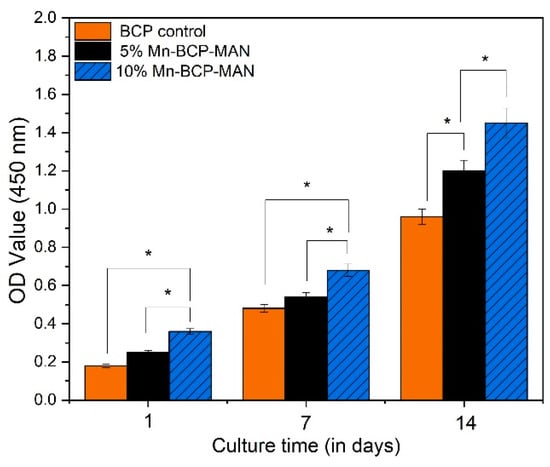 The MTT assay was used to examine MG63 cell viability on 5% and 10% Mn-BCP-MAN scaffolds. The cell density of both the scaffolds was evaluated after culturing for 1, 7, and 14 days, as shown in Figure 8. Pure BCP was used as the control specimen. On day 1, cell viability of the 10% Mn-BCP-MAN scaffold was modest, but on days 7 and 14, the cell proliferation rate was higher than the 5% Mn-BCP-MAN scaffold. For all cultured days, the statistical analysis resulted in a significant difference (p < 0.05) in cell density between the 5% and 10% Mn-doped BCP-MAN scaffolds.