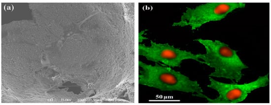Assessment of the 10% Mn-BCP-MAN scaffold by SEM (Figure 9a) and CLSM (Figure 9b) on the 14th day of culture exhibited elongated cells spread throughout the scaffold surface by establishing cell-to-cell contacts on 10% Mn-BCP-MAN. Adherent cells seemed to be well spread with elevated cytoplasmic volume and higher amounts of fibrillar projections. Moreover, the cells showed a well-aligned F-actin cytoskeleton having intense staining at the boundaries of cells with the appearance of prominent nuclei and cell division [31].