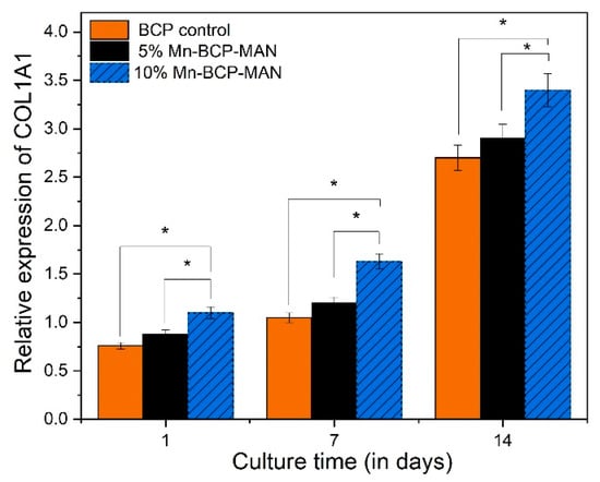Osteogenic gene expression was used to assess the differentiation of MG63 cells on both 5% and 10% Mn-BCP-MAN scaffolds. Pure BCP was used as the control specimen. The expression level of osteogenic genes of COL1A1 (Figure 10), RUNX2 (Figure 11), and OCN (Figure 12) increased from day 1 to day 14 for MG63 cells on both 5% and 10% Mn-BCP-MAN scaffolds. In comparison to the 5% Mn-BCP-MAN scaffold, the 10% Mn-BCP-MAN scaffold demonstrated greater gene expression levels (p < 0.05). Table 1 shows the forward and reverse primers for quantification of expression of the relevant genes.
