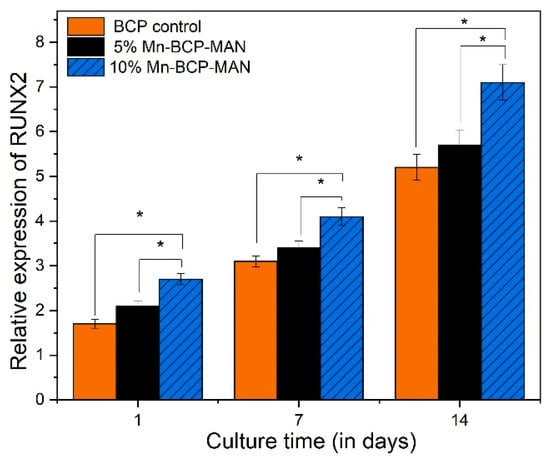 Measurement of ALP activity was carried out to assess the capability of the scaffolds to accelerate osteoblast cell differentiation (Figure 13). Pure BCP was used as the control specimen. After 7 days of culture, osteoblast cells in contact with the 5% Mn-BCP-MAN scaffold surface exhibited insignificant ALP activity compared to those on the 10% Mn-BCP-MAN scaffolds (p < 0.05). However, after 14 days of culture, there seemed to be significantly higher ALP activity on 10% Mn-BCP-MAN scaffolds than the 5% Mn-BCP-MAN scaffolds.