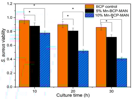 Viability of Staphylococcus aureus on the scaffolds; * denotes p < 0.05.