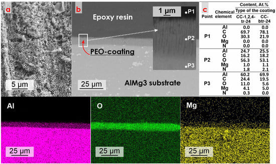 SEM/EDS data of the morphology (a,b) and elemental composition of the PEO-coating. EDS data of the element distribution at three points in the cross-section of CC-1,2,4-tr-24 and CC-btr-24 (c). The arrow shows the place at composite coating (PEO-layer presented as an example), where EDS spectra were acquired.