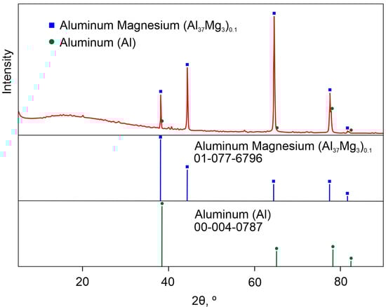 According to the results of XRD analysis, only the aluminum (Al) and aluminum magnesium (Al37Mg3)0.1 intermetallic compound belonging to the substrate were detected as the crystal phases in the composition of the PEO-coated sample (Figure 3). Al-Mg intermetalide in the composition of the substrate is a result of alloying the aluminum with magnesium [54]. Based on the presented data, it can be assumed, that Al- and O-containing compounds (probably Al2O3), spotted by the EDS method are in the amorphous state, which can be related to the wide halo shown at low angles (up to 30°). However, if we take into account the harsh conditions realized during PEO process (temperature in the plasma discharge channels up to 104 K) and pressure (up to 102 MPa), the presence of aluminum in metallic form and (Al37Mg3)0.1 in the coating composition (according to XRD results) is impossible and was caused with low X-ray reflectance of PEO-layers. As a result of high heating and sharp cooling the sample (duration of discharge lifetime equal to 10–200 µS) the substance on the substrate/coating interphase transfers into an amorphous condition. XPS data presented below confirm this suggestion.