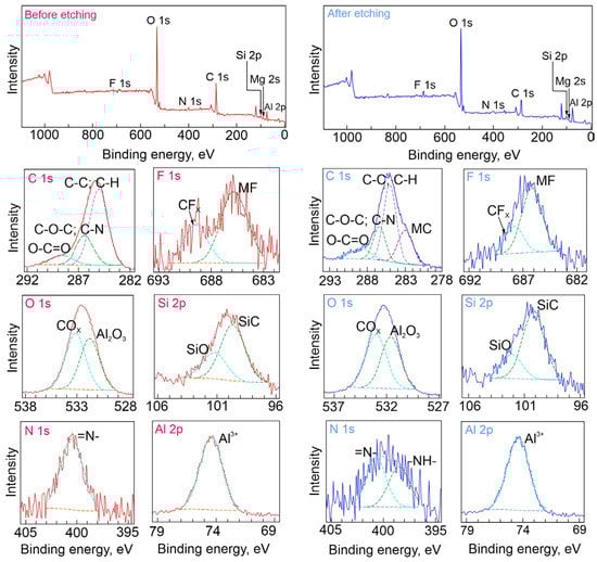 X-ray photoelectron spectroscopy was used for the determination of chemical composition of the formed protective composite layers. The CC-1,2,4-tr-24 and CC-btr-24 samples were analyzed by the XPS method. The CC-1,2,4-tr-24 sample (before etching, Figure 4) contains a significant amount of oxygen, carbon, and aluminum (Table 1). The binding energy (Eb) of Al 2p (74.4 eV) and O 1s (at Eb = 531.7 eV) demonstrates the presence of Al2O3 in the analyzed layer. Nitrogen of both “pyrrole” and “pyridine” types, detected at binding energies 400 and 399 eV is related to the presence of these forms of the heteroatom in 1,2,4-triazole (Figure 4, Table 1) and benzotriazole (Figure 5, Table 2) compounds. After etching (3 min, E (Ar+) = 5000 eV), the proportion of aluminum noticeably increases, while that of carbon decreases. This indicates the removal of contaminants and part of the inhibitor-containing layer. Spectra obtained for a benzotriazole-containing sample CC-btr-24 (Figure 5, Table 2) are comparable to the ones observed for the sample with 1,2,4-triazole-containing coating CC-1,2,4-tr-24. The content and state of the respective chemical elements differ slightly. The similarity of the C 1s spectra for 1,2,4,-triazole and benzotriazole-containing samples indicates a similar contribution of the inhibitor agent to the composition of the analyzed layer (about 3–5 nm thick), in which PEO structures, primarily Al2O3, dominate. XPS analysis also detects such chemical states of elements in the coating composition as: CFx, COx, MF*, MC*, SiO, SiC, Mg2+ (M stands for the metal), which indicates the formation of different substances as a result of PEO process. Mg and Si are the alloying elements of the AlMg3, whereas C, O, and F are related to the composition of the electrolyte. The presence of the C-N in C 1s spectra also confirms the coating impregnation with azole inhibitors.