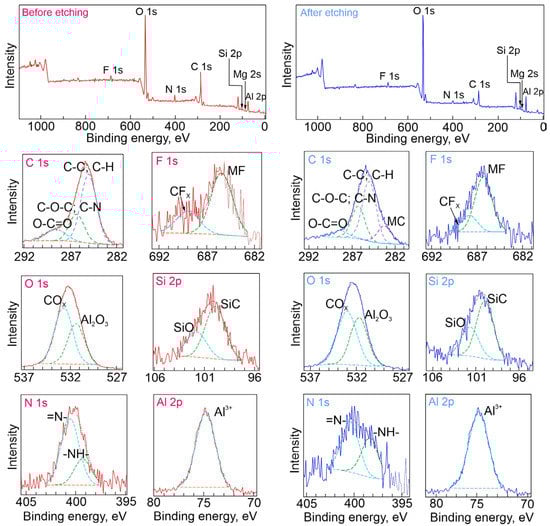 The chemical analysis of CC-1,2,4-tr-24 and CC-btr-24 obtained on a AlMg3 aluminum alloy was performed using X-ray photoelectron spectroscopy (XPS). The surface was studied under ultrahigh vacuum (0.5 µPa) by means of a spectrometric complex SPECS (SPECS GmbH, Berlin, Germany) with a hemispherical electrostatic energy analyzer PHOIBOS-150 using non-monochromatic AlKα radiation with an energy of 1486.6 eV. The aliphatic carbon line (C1s line) with a binding energy of 285.0 eV was used for spectra calibration. The surface of specimens was Ar+-etched for 3 min at an energy of 5000 eV to remove the contaminators and to provide the analysis of the inner layers of the formed coating. The ion etching results in coating thickness decreasing by 3–5 nm.