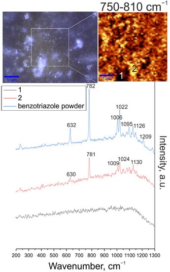 Image of the studied region in the sample, map of the benzotriazole distribution (2D map was designed using a filter in the spectral range of 750–850 cm−1 corresponding to the characteristic peak for benzotriazole), Raman spectrum of benzotriazole powder and Raman spectra of surface areas corresponding to areas of high and low content of the inhibitor.