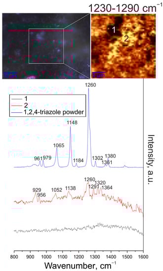 To determine the distribution intensity of benzotriazole and 1,2,4-triazole over the surface of the coated samples, 2D maps were designed using a filter in the spectral range of corresponding with most intensive characteristic peaks, namely 750–810 cm−1 for benzotriazole (“breathing” vibrations of C = C bonds of the benzene ring at 790 cm−1) and 1230–1290 cm−1 for 1,2,4-triazole (stretching vibrations of the N = N double bond of the triazole ring ν(N = N)). An optical image of the studied coating areas (highlighted by a frame) and a 2D map showing the distribution of benzotriazole and 1,2,4-triazole over the surface are presented in Figure 6 and Figure 7. An analysis of the experimental data indicates the distribution of the inhibitor over the coating surface. The area of light zones (areas with a high concentration of benzotriazole and 1,2,4-triazole) is significantly higher than the dark areas. The lower concentration of the inhibitor recorded in the dark areas may be due to the complex morphology of the coating and the deposition of most parts of the inhibitor in the pores of the protective layer. The spectra recorded in the regions marked by 1 and 2 correspond to the areas with high and low inhibitor content.