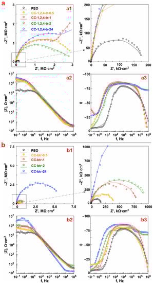 Nyquist (a1,b1) and Bode (a2,b2), (a3,b3) plots for samples with 1,2,4-triazole- (a) and benzotriazole-containing coatings (b) after 1 h exposure to 3.5 wt.% NaCl solution.