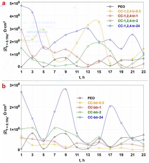 Evolution of |Z|f=0.1Hz values for samples with 1,2,4-triazole- (a) and benzontriazole (b) containing coatings during 24 h of exposure to 3.5 wt.% NaCl solution.