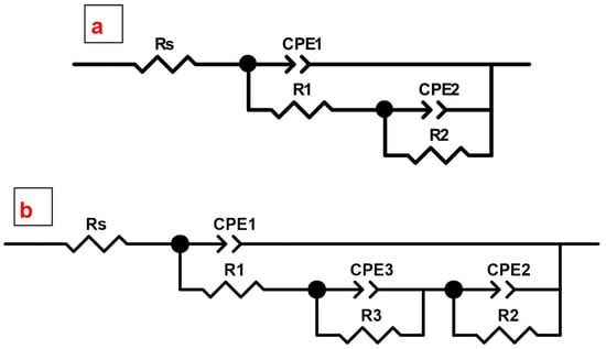 Equivalent electrical circuits (EEC) used for fitting the impedance spectra for PEO-, composite (a) and hybrid coatings (b).