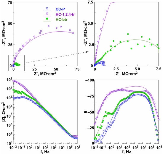 To improve the protective properties of the samples as well as to promote the prolongation of the self-healing effect, the specimens with composite inhibitor-containing coatings with the best anticorrosion properties (CC-1,2,tr-24, CC-btr-24) were treated with PVDF. These samples designated below as HC-1,2,4-tr and HC-btr, respectively, were studied by EIS. The curves for the CC-P sample are presented for comparison (Figure 11).