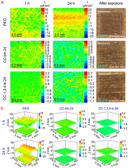 SVET measurements were performed using a Pt-Ir wire. A Pt black was deposited on an electrode’s spherical tip with a diameter of 10 µm. Probe vibrations were implemented in X and Z axis (horizontal and vertical directions, respectively, relative to the studied surface) with a frequency of 128 Hz (X) and 325 Hz (Z). The amplitude was 25 µm. Vertical vibration (Z axis) was used to calculate the corrosion current density.