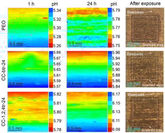 Experiments were carried out in a 0.05 M NaCl solution due to the best signal/noise ratio. Calibration of a SIET electrode was realized according to the Nernst equation using buffer solutions. The Nernst slope was 57 ± 0.6 mV∙pH−1. Local electrochemical measurements were controlled using ASET 2.0 software (ScienceWares, Falmouth, MA, USA). A preamplifier with 1 PΩ input impedance was used to measure the potential. Quasi-simultaneous SVET/SIET measurements were made on AlMg3 aluminum alloy PEO-coating, CC-btr-24, and CC-1,2,4-tr-24 samples.