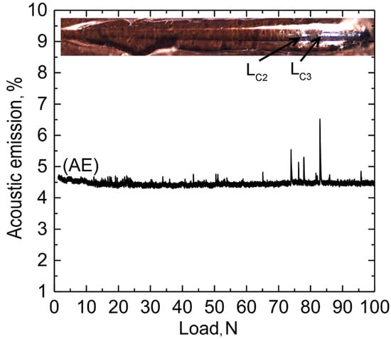 According to the photo of the scratch and acoustic emission (AE) data, at a speed of 12 N min−1, the indenter scratched the HC-1,2,4-tr specimen at a load LC3 = 83 ± 3 N (LC3 is a load at which the coating is abraded to the metal substrate, Figure 14). The first evidence of the destruction of the protective layer is observed at LC2 = 77 ± 3 N. These results indicate the high mechanical characteristics and adhesion of the inhibitor-containing PEO-coating treated with PVDF.