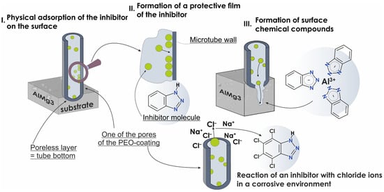 - Active physical adsorption of triazoles on the surface of the PEO-coating due to the high affinity of aluminum and magnesium (which is the main alloying element in the AlMg3 alloy) to nitrogen (Figure 15, stage I). At the first stage, aggressive chloride ions can be captured by the corrosion inhibitor to form the compound 4,5,6,7-tetrachloro-1H-1,2,3-benzotriazole (as presented in Figure 15) [68].