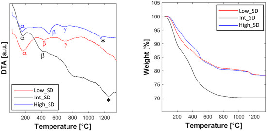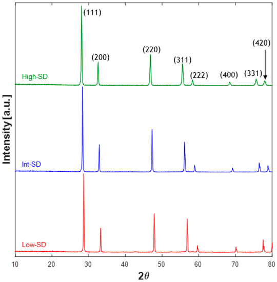 The thermogravimetric plots show similar trends for sample High_SD and Low_SD, being both characterized by a global weight loss slightly greater than 20%, distributed in three main thermal events, corresponding to three endothermic events in the related DTA curves, whose peaks are centered at about 200 °C, 500 °C, and 700 °C (marked in Figure 2 with α, β, and γ, respectively). The first thermal event (α) is related to the evolution of adsorbed water on the powders [4], whereas the other thermal events (β and γ) are related to the thermal decomposition of hydroxides/hydrated oxides formed upon co-precipitation [4]. Anyway, in both cases, the thermal decomposition ends at about 800 °C. Apparently, the thermogravimetric plot of sample Int_SD is different, being characterized by a total weight loss close to 30%; additionally, by carefully analyzing it, one can note that Int_SD weight loss up to 200 °C is well greater than the corresponding one in the same temperature range for High_SD and Low_SD (around 4% for Int_SD and around 10% for both High_SD and Low-SD). In other words, the difference of total weight loss in the sample Int_SD is partly due to a larger amount of physically adsorbed water, very likely due to random reasons, such as external moisture conditions (the three samples were prepared in different days), and not to substantial differences in samples’ thermal behaviors. As a confirmation of that, the DTA plot of sample Int_SD is rather similar to the other ones, even though its thermograph exhibits a drift likely masking the event γ. However, there is a noteworthy difference between the DTA curve of Low_SD and the DTA curves of Int_SD and High_SD: the absence in the former of a further endothermic peak (indicated with “*” in Figure 2) appearing at high temperature for Int_SD and High_SD at about 1250 °C and 1150 °C, respectively. As these endothermic peaks are not associated with any decomposition event (no weight loss is associated with them), they could be related to a phase transformation and, in particular, to the entropy-driven transition from multiple phases to the fluorite-like single-phase. As for sample Low_SD, the absence of an analogous peak could be explained with the hypothesis that the entropy-driven transformation occurs outside the range of temperature investigated in the DTA-TG runs (i.e., the transition temperature should lie above 1300 °C). In conclusion, the findings deduced from the thermal analyses are the following ones: the decomposition events ended for all samples at around 800 °C, and there is indirect evidence of the entropy-driven transition from multiple phases to fluorite-like occurring at temperatures lower than 1300 °C for samples High_SD and Int_SD, consequently suggesting that there exists a correlation between SD and the typical ESO entropy-driven transition.