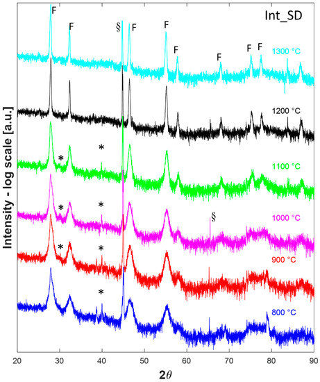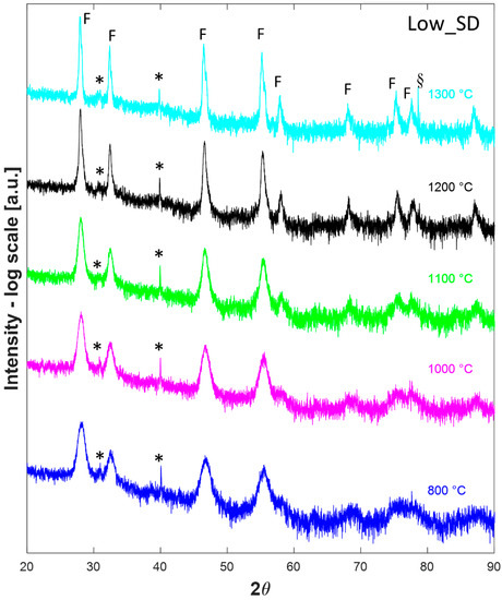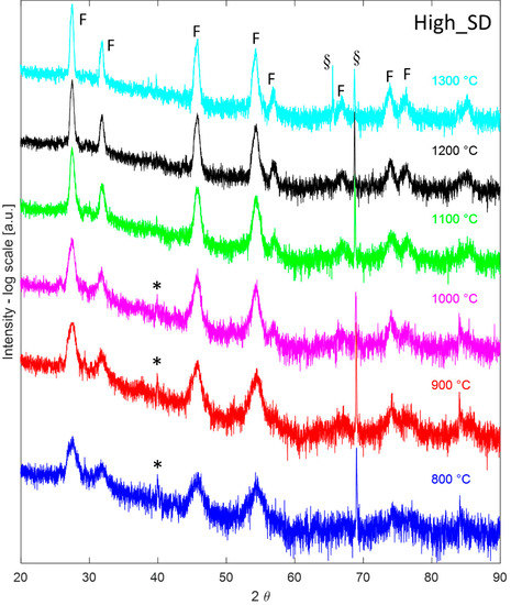 Thus, after a calcination step at 800 °C for 1 h in a conventional furnace, all the samples were analyzed in HTK16, collecting their diffraction patterns at temperatures ranging from 800 °C to 1300 °C after a dwell time of 1 h. Such diffraction patterns are displayed in Figure 3, Figure 4 and Figure 5 for the samples Low_SD, Int_SD, and High_SD, respectively. It should be noticed that in several diffraction patterns some additional signals, not belonging to crystallographic phases of interest for the current study, can be recognized, likely originating from the platinum sample holder or other mechanical parts of the furnace. In particular, the peak located at around 79° in the diffractogram collected on sample Low_SD at 1300 °C is likely due to the (311) reflection of Pt cubic lattice, whereas the signals present at about 45° in all H.T. data collected on sample Int_SD can be ascribed to Pt (200) reflection. Additionally, peaks around 65° found in patterns 800 °C, 900 °C, and 1000 °C of sample Int_SD and 1300 °C of High_SD are possibly due to the Pt (220) reflection, while signals located at about 78° in all High_SD H.T. data are of unknown origin, and could be due to some generic, unshielded scattering from the furnace steel frame. Even though some authors prefer to remove “a posteriori” these spurious signals from the diffraction patterns, generally speaking, we rather preferred to leave them. Anyway, these spurious signals are properly marked in all the following Figures.