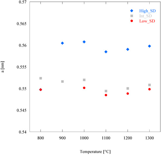 Figure 6 shows the plot of Low_SD, Int_SD, and High_SD lattice parameter a, obtained by Unit Cell Refinement, as a function of. First, the a’s values in Figure 6 are in the same order of the values in Table 1, i.e., a’s of Low_SD samples are lower than a’s of Int_SD, and these last ones are lower than a’s of High_SD. There is only the exception of samples calcined at 800 °C, but in this case, the poor crystallization occurred at such a temperature could impair the evaluation of the lattice parameters.