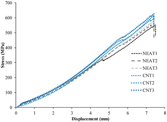 Load-displacement curves of the axial tension test are depicted in Figure 4. The results demonstrated that the average tensile stress of CNT1, CNT2, and CNT3 at failure was 612 MPa, while for NEAT1, NEAT2, and NEAT3, it was 564 MPa. The maximum tensile stress values of CNT1, CNT2, and CNT3 were 5.7%, 8.8% and 11.1% higher than the averages of NEAT1, NEAT2, and NEAT3, respectively (Table 2). Therefore, it was determined that the samples with CNT carried 8.4% more axial tensile force on average than those with NEAT. All specimens exhibited linear elastic behavior and collapsed as soon as they reached a displacement of about 7.40 mm. However, when Figure 4 is examined, the samples with CNT have reached the same failure displacement with higher load-carrying capacities. The stress values are also depicted in Figure 4. The initial stiffness values, that is, the angle of the curve with the horizontal, were obtained more in the samples with CNT after the 4 mm displacement value.