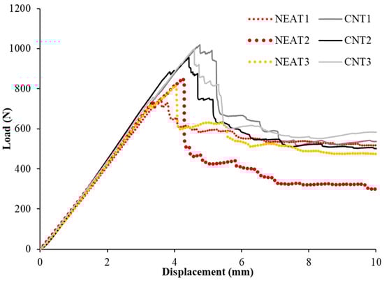 The load-displacement relationships of the samples under bending are shown in Figure 5. Flexural load carrying capacities were obtained as 1020 N, 956 N, and 998 N for CNT1, CNT2, and CNT3, respectively, while 752 N, 849 N, and 814 N were obtained for NEAT1, NEAT2, and NEAT3 samples, respectively. In this case, the CNT1 sample has 35.6%, 20.1%, and 25.3% more bending capacity than those of NEAT1, NEAT2, and NEAT3, respectively. A similar situation was obtained for CNT2 at 27.1%, 12.6%, and 17.4%, while for CNT3, it was 32.7%, 17.5%, and 22.6% (Table 3). In other words, the samples with CNT had an average of 23.4% more bending capacity than the samples with NEAT. The displacement values corresponding to the maximum load-carrying capacity of all samples varied between 3.57 mm and 4.75 mm. This situation can be explained by the variation of the stiffness values corresponding to the maximum load value. When the stiffness of the samples at the maximum load value were compared, a relationship such as CNT3 > CNT2 > CNT1 > NEAT1 > NEAT2 > NEAT3 was obtained. This shows that the stiffness of the CNT specimens improved along with their load-carrying capacity.