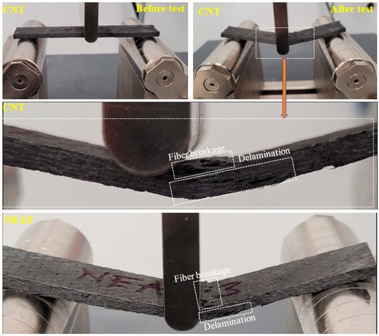 The damage modes on the samples are shown in Figure 6. The ultimate damage observed for all samples is delamination damage along the sample’s height (thickness = 3 mm) and fiber breakage in the compression region.