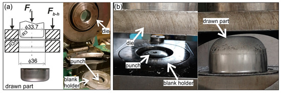 Moreover, in industrial conditions, the cylindrical drawn parts (Figure 2a) were formed on the double-action deep drawing hydraulic press, and the hat-shaped parts (Figure 2b) were formed on the hydraulic press having a spring-pressed blank holder.
