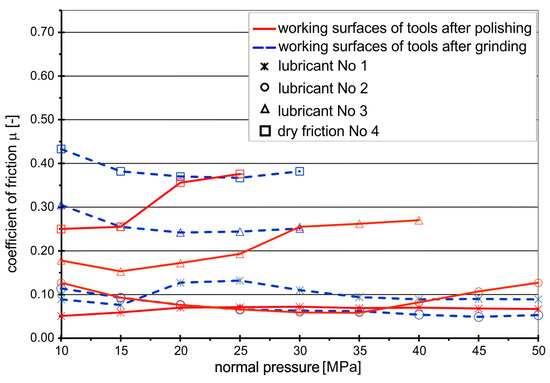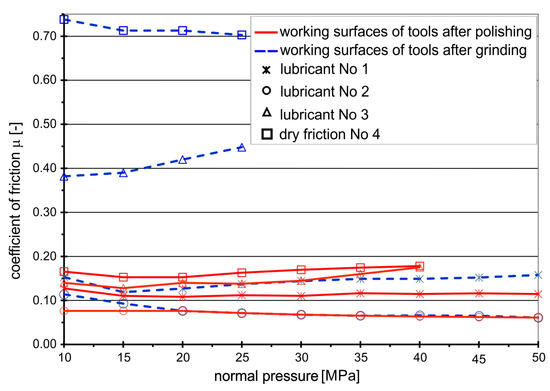 The values of the friction coefficients were slightly different when drawing the strips of the Grade 5 titanium sheet, which is characterized by higher mechanical parameters and much lower drawability than the Grade 2 sheet (Figure 4).