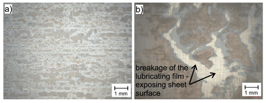 The analysis of the graphs presented in Figure 3 and Figure 4 shows that the effectiveness of lubrication is manifested not only by reducing the frictional resistance (lower coefficient of friction), but above all by increasing the durability of the lubricating film, which is particularly important in the case of sheet metal forming processes, where high normal pressures occur. Even if the presence of lubricant only slightly reduces friction, lubrication is still necessary because it prevents the formed materials from sticking to the working surfaces of the tools, which in turn leads to degradation of the surface quality of the drawn parts. The use of a lubricant in the form of boric acid as an additive to rapeseed oil effectively protects the frictional surfaces against direct contact, both in the case of Grade 2 and Grade 5 sheets. Lubricant in the form of boric acid dissolved in methyl alcohol effectively separated the rubbing surfaces in the case of the Grade 2 sheet (Figure 5a—homogeneous lubricant layer), while in the case of drawing the Grade 5 sheet, the breaking of the lubricating layer was observed at increased normal pressure (Figure 5b—breakage of the lubricating films), which led to an increase in the CoF value.
