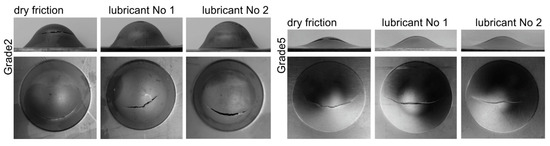 The difference in the failure mode in the case of forming Grade 2 and Grade 5 titanium sheets under dry friction is due to the drawability of these materials (a Grade 2 titanium sheet has much higher drawability than a Grade 5 one), which means that the contact surface and frictional forces between the tool and the sheet are different, so the strain distribution on the sheet surface is also different, and thus the location and course of the crack are different. The greater drawability of the Grade 2 sheet means a larger contact zone of this sheet with the surface of the tool, and because the thinning of the sheet occurs beyond the contact zone of the tool with the sheet, the cracking of the Grade 2 sheet appears further from the drawn part’s pole.