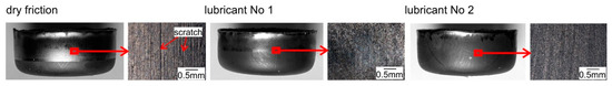 The results of the Erichsen cupping test are presented in Figure 6 and in Table 4. The tests were carried out without lubrication and in the presence of lubricants containing boric acid (No. 1 and No. 2), i.e., those that effectively separated the rubbing surfaces during the strip drawing test and ensured the lowest frictional resistance.