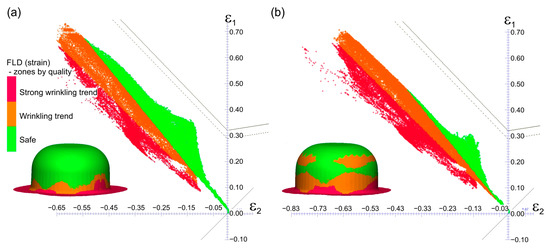 Evaluation of the deep drawing process using the forming limit diagram (zones by quality): (a) 1st variant of forming with dry friction; (b) 2nd variant of forming with lubrication.