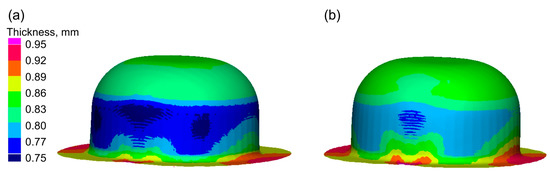 Thickness distribution in the drawn part wall: (a) dry friction; (b) with lubricant.