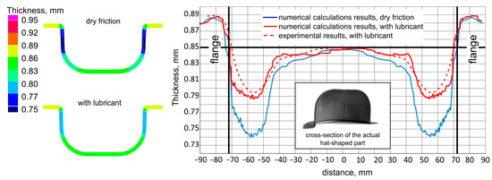 The graph (Figure 14) shows a clear influence of lubrication (continuous red line) on the reduction of wall thinning in comparison to the drawn part formed in the conditions of technically dry friction (continuous blue line). There is also a quite good convergence between the wall thicknesses of the drawn part measured in the experiment (red dashed line) and the thicknesses obtained from numerical calculations (solid red line). Such convergence indicates the possibility of further analyses of the sheet titanium forming process based on numerical calculations.