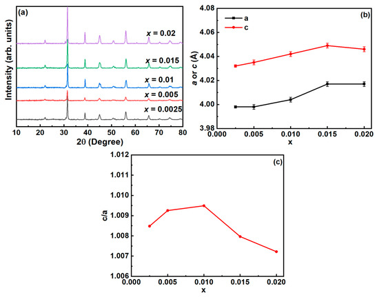 The phase of the samples was determined by X-ray diffraction analysis, and the corresponding patterns are presented in Figure 1a for the BT-NBT-Yb-xMn ceramics. The samples gave similar XRD patterns, which match the BT tetragonal phase [27], and no obvious impurity reflections were observed. A single-phase perovskite structure with tetragonal symmetry was exhibited with the sample x = 0.015, showing a distinct peak splitting of (002) and (200) peak at around 45° in the 2θ range representing a normal tetragonal structure, but the peaks overlap each other in other samples representing a pseudo-cubic structure, which means it is hard to recognize the tetragonal phase or cubic one from the peak splitting. The lattice parameters and tetragonality utilizing the Pawley refinements program in the as prepared samples are shown in Figure 1b,c. Both the a and c increase with the increase of x and reach the maximum as x = 0.015, which means that a solid solution was formed at x ≤ 0.015. Referring to the ionic radii of Mn and Ti4+ in the octahedra [coordination number CN = 6, R(Mn2+) = 0.83Å, R(Mn3+) = 0.58Å, R(Mn4+) = 0.53Å, R(Ti4+) = 0.61Å)] [28], it can be inferred that the Mn in the solid solution should be Mn2+ and B-O bonds (B = Mn, Ti) become longer as Mn2+ is added. The tetragonality (c/a) of the samples gradually increases from 1.0085 for x = 0.0025 to 1.0095 for x = 0.01, and then decreases to 1.0072 for x = 0.02. Notably, the tetragonality (c/a) values are quite close to the ideal cubic condition with c/a = 1.000, leading to the definition of the samples as pseudo-cubic phase. As the ionic radii of Mn and Ti4+ differ, Mn causes more significant distortions in [BO6] (B = Mn or Ti) octahedra than in the original BT-NBT-Yb. This is expected to affect the diffusion in the phase transition (dielectric relaxing) of the samples [29].