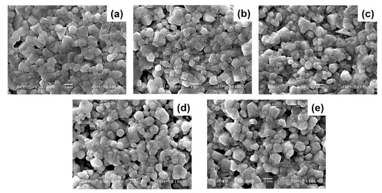SEM images of fractured BT-NBT-Yb-xMn ceramics samples. (a) x = 0.0025, (b) x = 0.005, (c) x = 0.01, (d) x = 0.015, (e) x = 0.02.