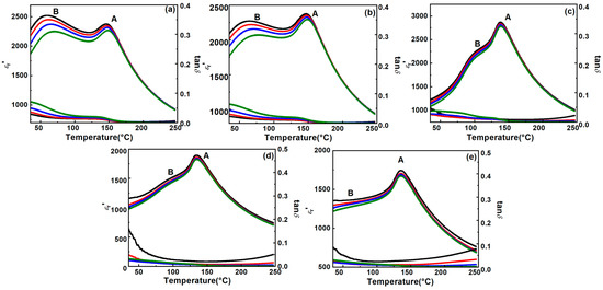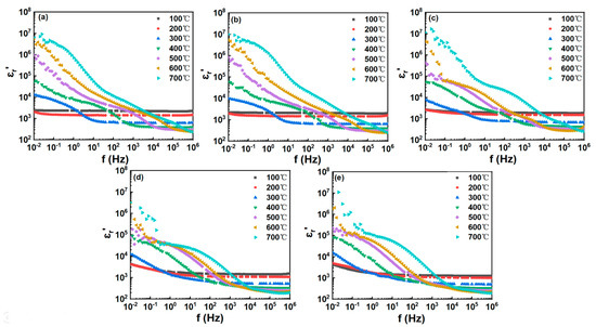 The real part of permittivity (εr′) as a function of frequency at different temperatures of the BT-NBT-Yb-xMn ceramic is shown in Figure 7a–e. At very low frequencies, the εr′ increases for all samples as the temperatures increase. At temperatures 200–700 °C, there are broad dispersed steps with relatively high permittivity observed in the low frequency region and the step shifts to a higher frequency with the increase of temperature. This behavior is associated with a frequency-dependent orientational polarization. For x = 0.0025, high dielectric permittivity (at ≤10 Hz) is observed at high temperatures. The εr′ at 0.01 Hz is almost two magnitudes of orders larger than that at 10 Hz. This should be caused by extrinsic contributions such as space charge localization at the grain boundaries [33]. The permittivity εr′ is almost independent of frequency at low temperatures (≤200 °C) with plateaus for all samples, except slight increases at low frequency (f < 1 Hz) for x = 0.015 and x = 0.02 samples.