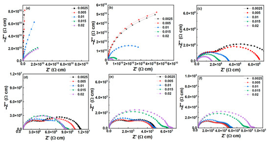 Nyquist plots of BT-NBT-Yb-xMn samples at various temperatures. (a) 100 °C, (b) 200 °C, (c) 300 °C, (d) 400 °C, (e) 500 °C, (f) 600 °C.