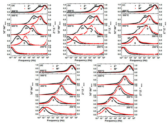 The normalized −Z″ and M″ of BT-NBT-Yb-xMn at 200–600 °C. (a) x = 0.0025, (b) x = 0.005, (c) x = 0.01, (d) x = 0.015, (e) x = 0.02. g: grain; gb: grain boundary.