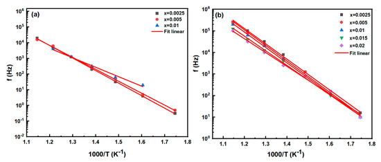 The impedance Z* plots for all samples in a wide temperature (100–600 °C) are measured and shown in Figure 4. At low temperatures (≤200 °C), each sample exhibits a single or partial semicircle, indicating a response attributed to the grain. This suggests that the grain provides high resistance, which is advantageous for minimizing dielectric loss associated with low leakage current. There are two overlapping arcs observed at T ≥ 300 °C for samples with x ≤ 0.01, which are from the grain and grain boundaries of the ceramics. However, there was only grain arc response observed for samples with x ≥ 0.015.