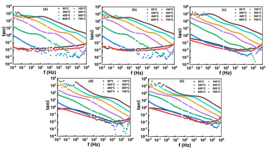 The frequency-dependent tanδ at different temperatures of BT-NBT-Yb-xMn ceramics are shown in Figure 8. The tanδ shows a plateau at temperatures below 100 °C, which is less than 0.06 from 0.01 Hz to 106 Hz and remains almost unchanged with x ≤ 0.005. At 50 °C, the tanδ at 1 KHz are 0.02, 0.02, 0.02, 0.03, 0.02 for x = 0.0025, 0.005, 0.01, 0.015 and 0.02, respectively. The samples show lower tanδ (≤0.06) as x ≤ 0.01, and tanδ increases with x > 0.01. As temperature increases, the samples show a higher tanδ step at a low frequency, and the step shifts to a higher frequency. For example, as x = 0.005, the maximum of tanδ located at the frequency of 3.98 Hz, 251 Hz, 6309 Hz, 50,119 Hz and 39811 Hz at 300 °C, 400 °C, 500 °C, 600 °C and 700 °C, respectively. This can be described as RC resonance at a lower frequency and smaller polarization at a high frequency.