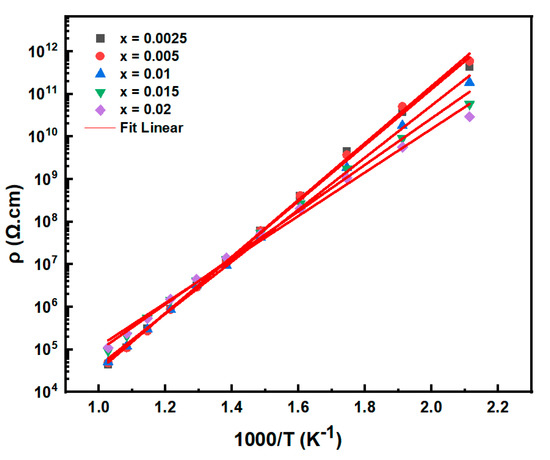 The temperature-dependent resistivity of BT-NBT-Yb-xMn samples are shown in Figure 9. At room temperature, the resistivity calculated from impedance analysis is ≥3 × 1012 Ω cm, ≥3 × 1012 Ω cm, 1.61 × 1011 Ω cm, 3.39 × 1010 Ω cm and 1.61 × 1010 Ω cm for x = 0.0025, 0.005, 0.01, 0.015 and 0.02, respectively. At 200 °C, the resistivity is 4.37 × 1011 Ω cm, 5.88 × 1011 Ω cm, 1.86 × 1011 Ω cm, 5.77 × 1010 Ω cm and 2.91 × 1010 Ω cm for x = 0.0025, 0.005, 0.01, 0.015 and 0.02, respectively. The resistivity shows a maximum at x = 0.005 and decreases with the increase of Mn. The resistivity of samples with x = 0.005 is about two times higher than that of samples with the BT-NBT-Yb sample. Thus, the doping of Mn shows an obvious increase in resistivity. The activation energy (Ea) calculated is 1.29 eV, 1.31 eV, 1.16 eV, 1.08 eV and 1.01 eV for x = 0.0025, 0.005, 0.01, 0.015 and 0.02, respectively. The activation energies decrease with the increase of Mn, and the samples with x ≤ 0.005 give the highest activation energy (Ea).